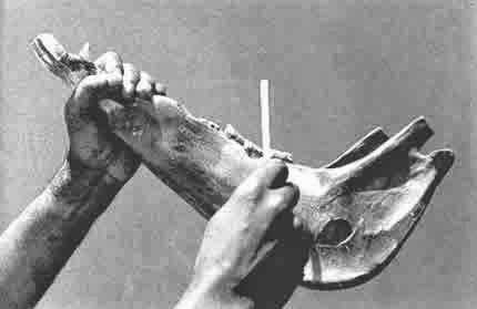 The jawbone as a musical instrument originated in Africa. It’s usually the jawbone of a zebra—or donkey, horse, mule, or cow—stripped of all flesh and dried to make the teeth so loose that they rattle around in their sockets. The jawbone came to the Americas along with the slave trade and was historically used in early American minstrel shows.