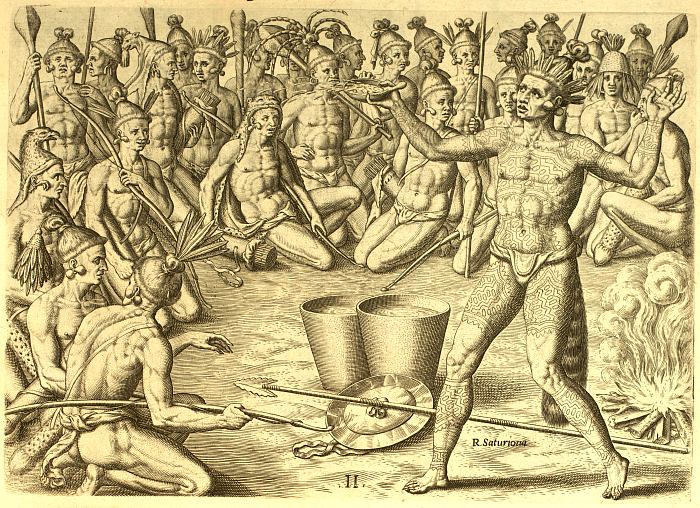 Timucua chief Saturiwa (fl. 1562–1565) preparing his men for battle by drinking yaupon tea