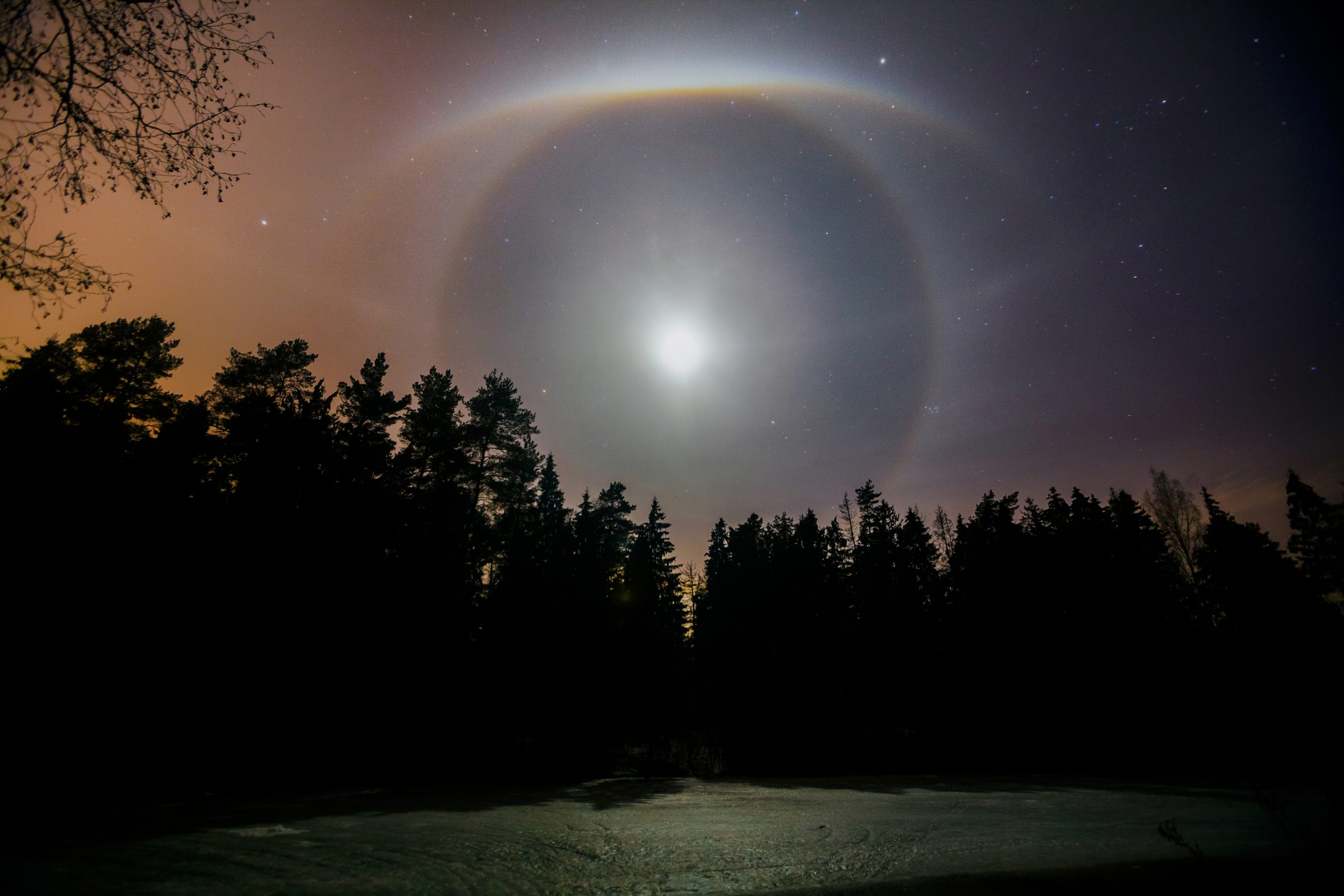 - Halos that frame the moon (or the sun) are produced by high, wispy clouds made of ice crystals.